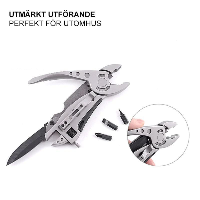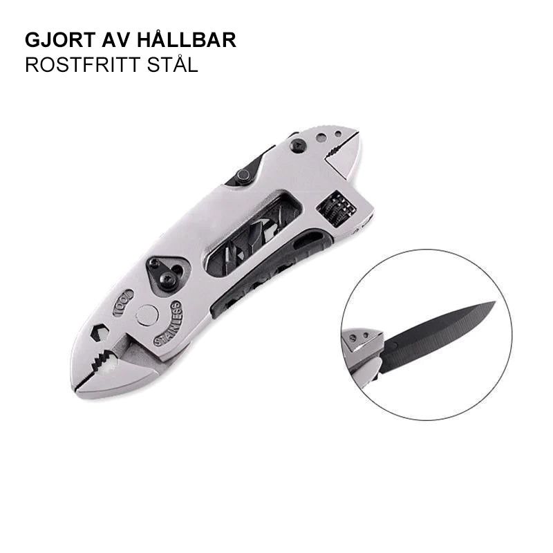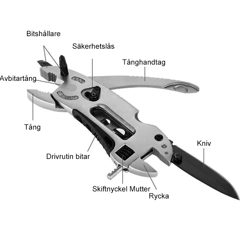 Mini multiverktygssats med justerbar kniv, skiftnycklar, käke, skruvmejslar och tång