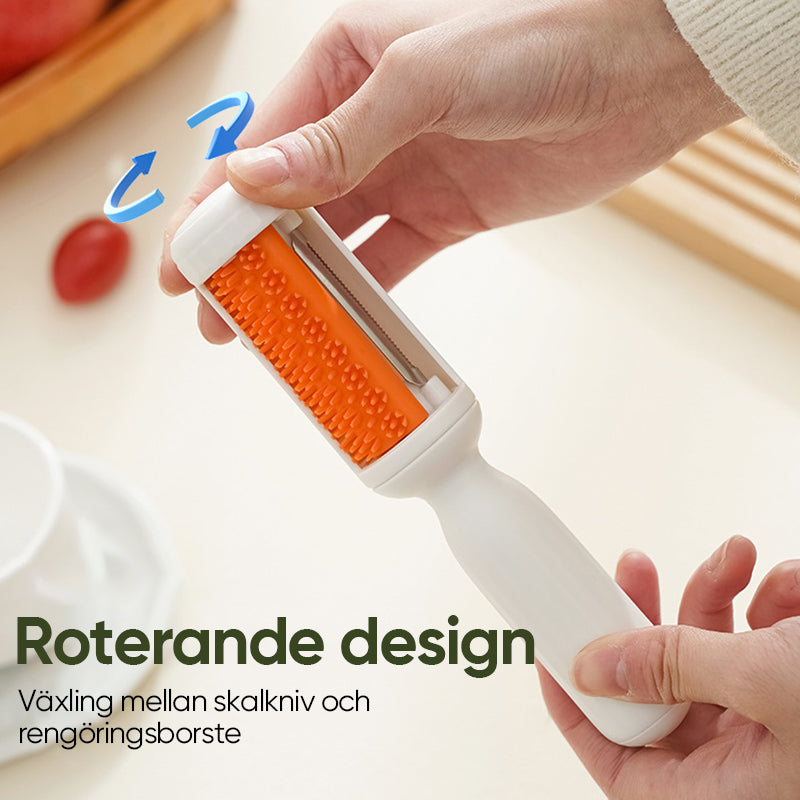 Två i en design. Denna moderna designfrukt- och grönsaksskalare levereras med två i ett skalblad för alla dina frukt- och grönsaksskalningsbehov så att du inte behöver köpa två olika skalare. Använd båda sidorna samtidigt för att skala olika typer av frukt och grönsaker och töm den när den är full.