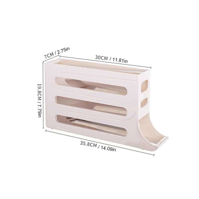 7° sluttande design: Säg adjö till besvärlig lockdragning med den automatiska glidande äggförvaringsboxfunktionen. Förvaringsstället har en 7° lutande design som gör att äggen rullar ner automatiskt och fyller i luckorna. Denna innovativa design säkerställer enkel åtkomst till ägg, eftersom de sömlöst glider ner för bekväm hämtning när det behövs.
