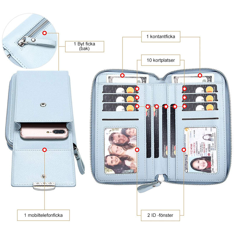 - Intern struktur: 1 kontantplats, 6 kortplatser, 2 ID -fönster, 1 blixtlåsficka, 1 telefonficka. Det är stor kapacitet men liten storlek, så du kan bära ditt kreditkort, ID -kort, pass, bankkort, visitkort, kontanter, mynt och checkbok i denna mångsidiga crossbody -väska/plånbok.
